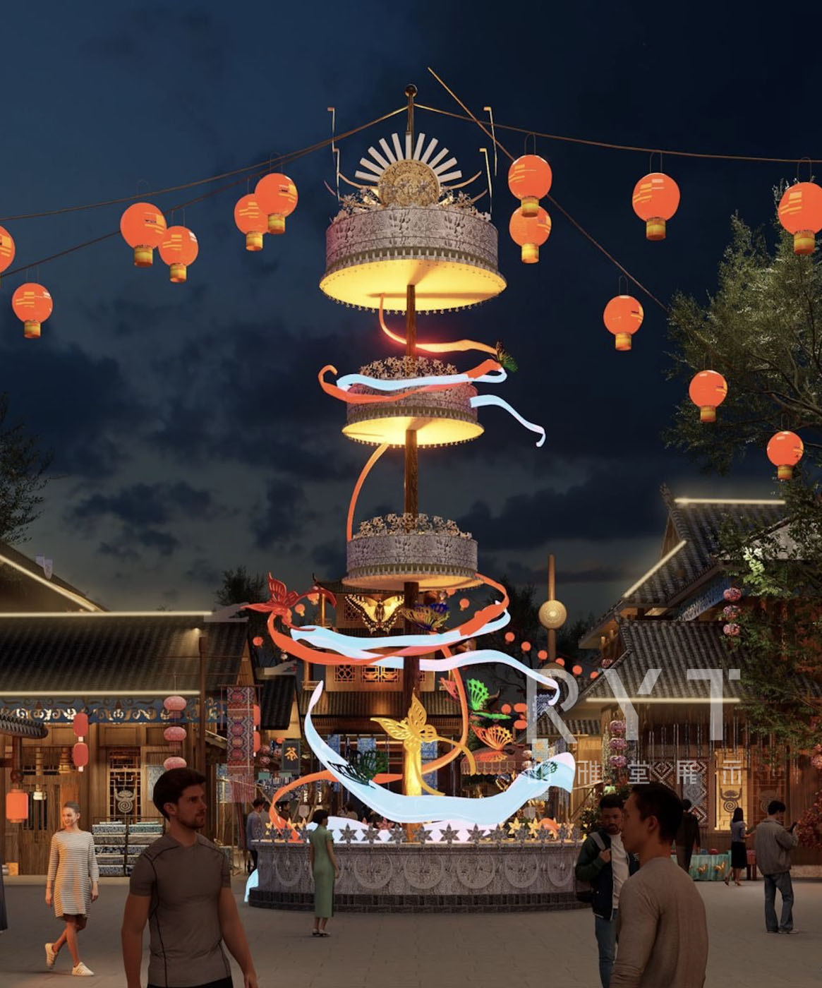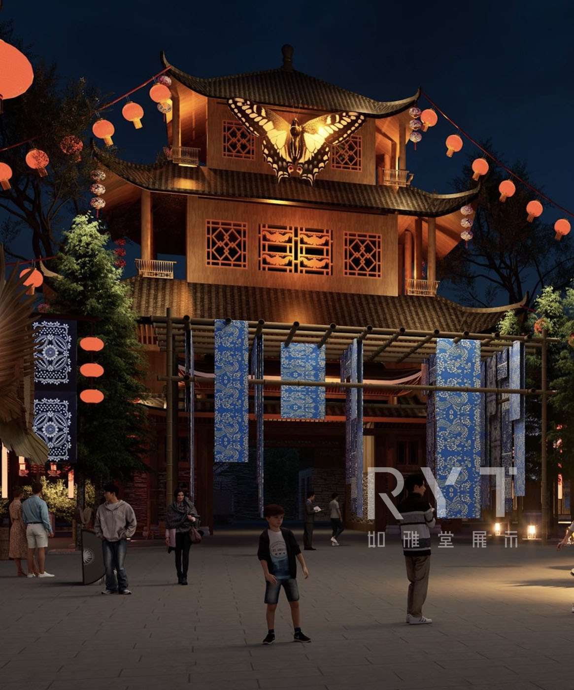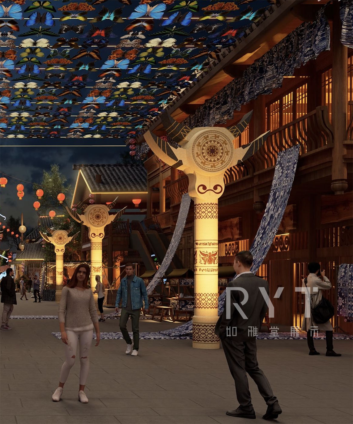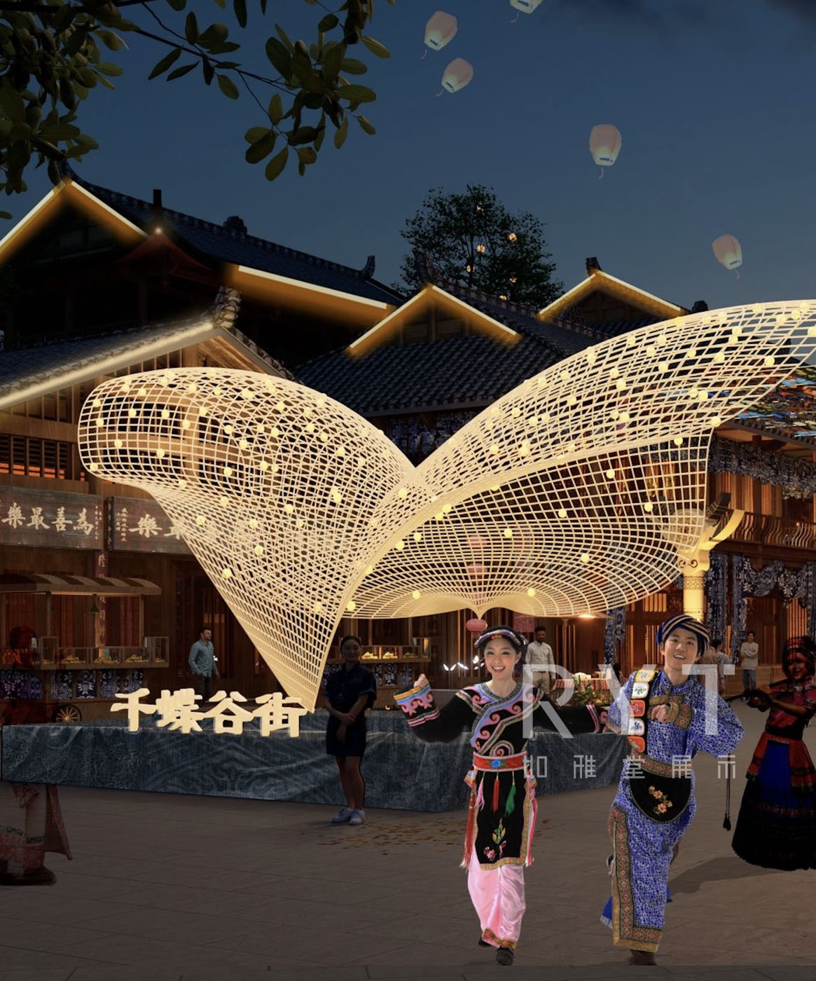 整體的設(shè)計靈感來源取自苗族服飾、蝴蝶??媽媽的典故,我們從中提取苗布、銀飾、蝴蝶的形態(tài),用于本案的美陳打卡、商業(yè)街氛圍提升中。解碼苗文化,故事情節(jié),再通過設(shè)計,賦予當(dāng)代文化主題商業(yè)街以生命,創(chuàng)造出豐富的文旅空間體驗。